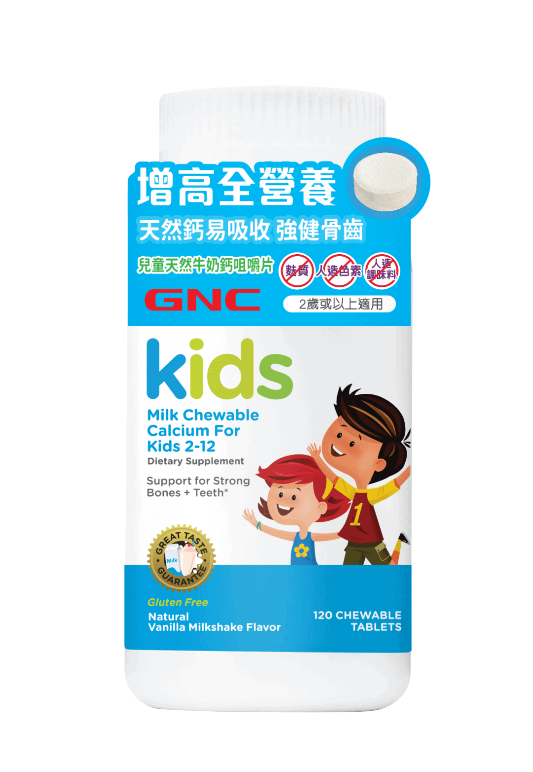 GNC 兒童咀嚼片牛奶鈣為兒童骨骼和牙齒生長提供全面支持。本產品在關鍵的生長發育期提供強化營養:鈣、維生素 D3、鎂、磷和鋅,有助於強健骨骼和牙齒,同時鎖住鈣質。