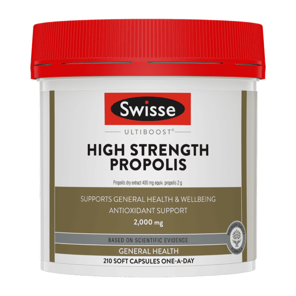 Swisse – Ultiboost 高濃度蜂膠提供良好天然生物類黃酮抗氧化劑,有助防止自由基損傷,促進整體健康。蜂膠同時含有豐富的維他命、礦物質和活性成份,能強效提升免疫力,有助分解體內毒素,增強體質,減輕過敏症狀,或有助於穩定血壓及血糖水平,維持心腦血管健康,並促進呼吸系統及肝臟健康。